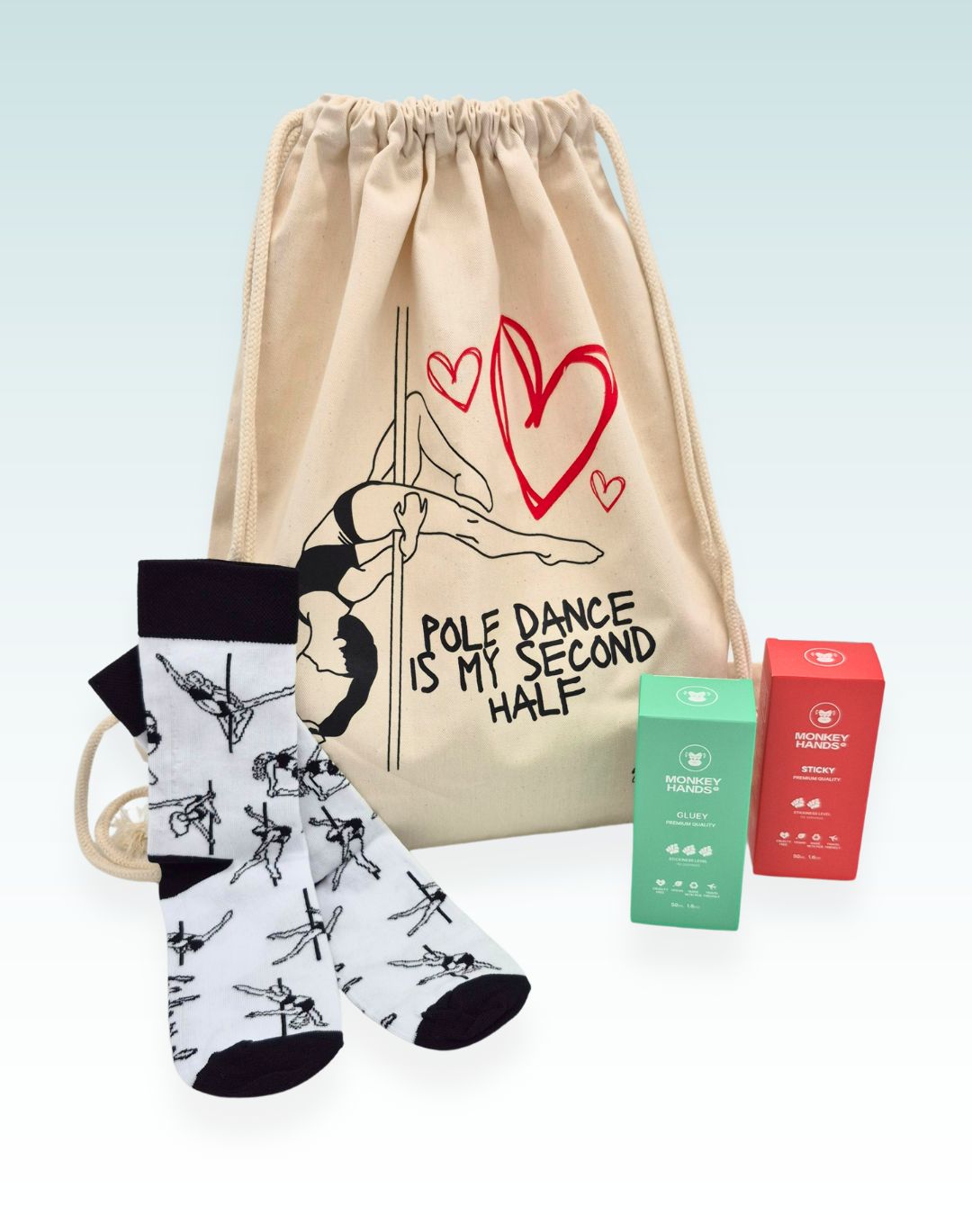 Das MelMoves Pole Kit vereint die wichtigsten Essentials fürs Training: Socken, 2x 50ml MONKEY HANDS Gripmittel & stylische Polebag. 😍