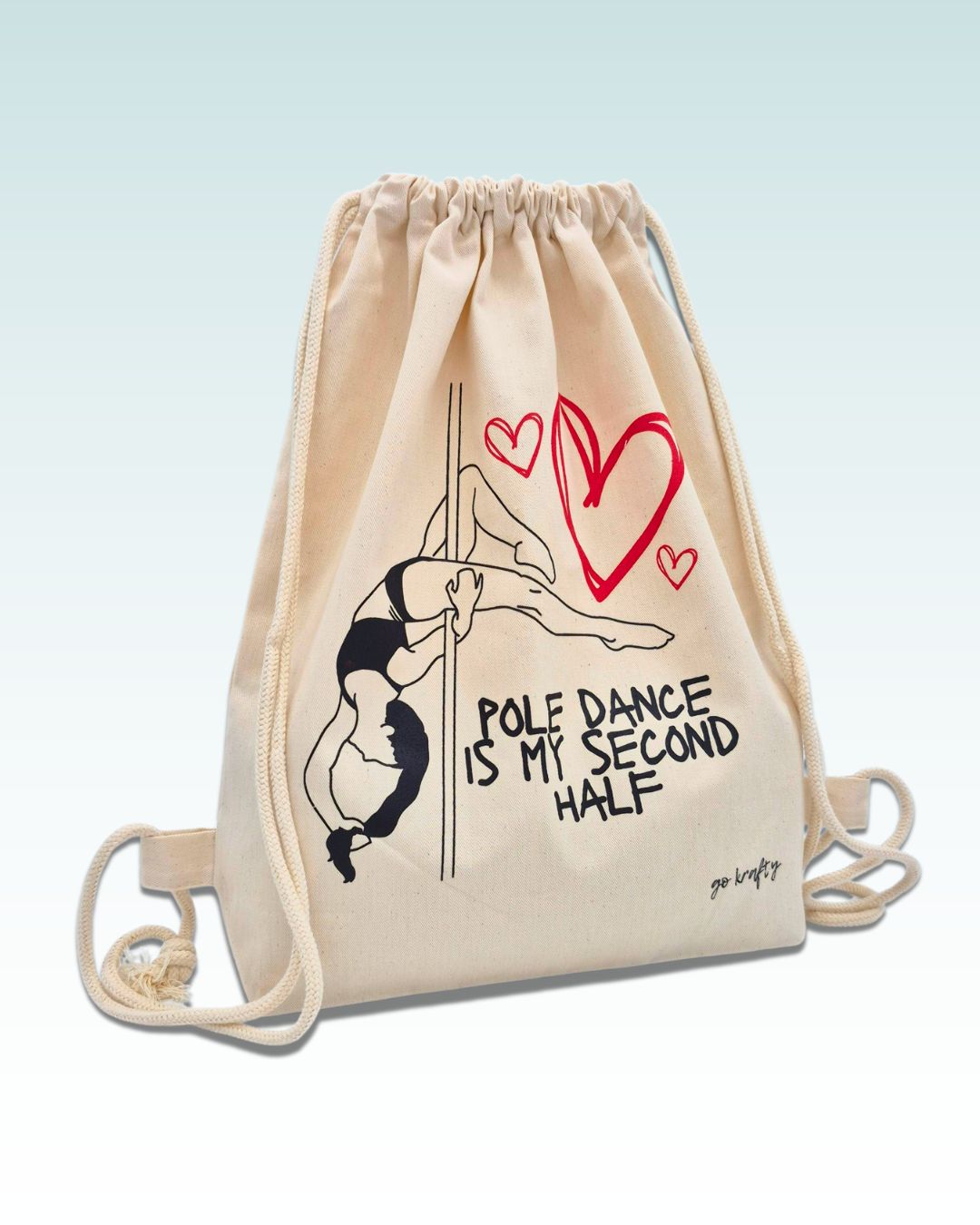 Hergestellt aus 100 % Baumwolle (140 g/m²) mit stabilem Boden (10 cm) und extra dicken Kordelzügen für bequemen Tragekomfort. Das exklusive Pole Dance Design macht ihn zu einem echten Statement-Piece für dein Training.